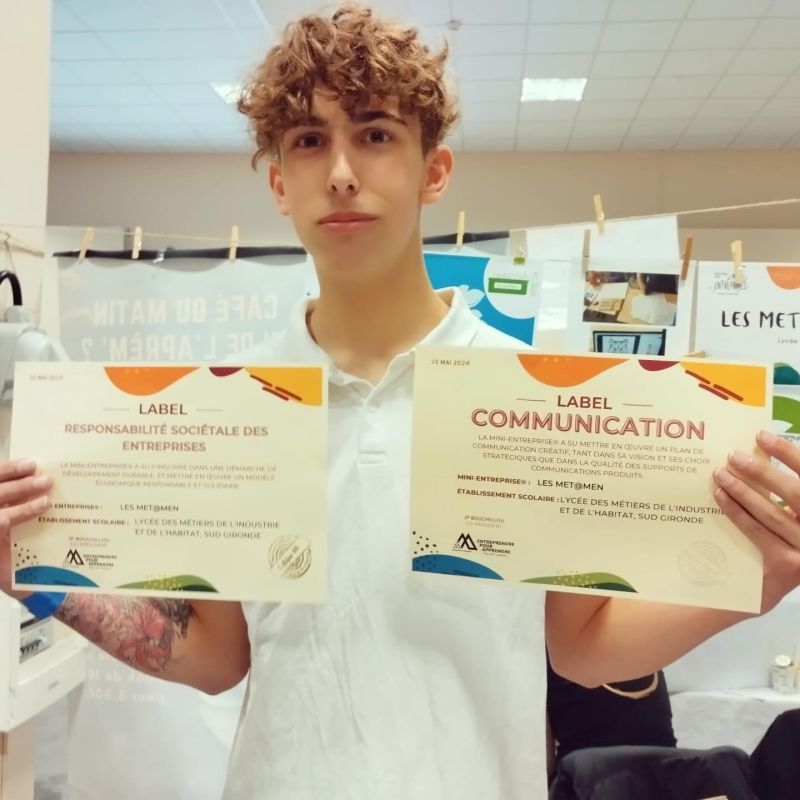 En parallèle à Poitiers, les classes de Terminales CAP Men et Met ont brillé avec leur projet de MINI ENTREPRISE de création d'objets avec les matériaux jetés des ateliers. Ils ont obtenu le premier prix dans la catégorie Développement durable et le deuxième prix de la catégorie Communication. Nous saluons l'accompagnement des professeurs: Mme Cazaux, M. Beylacq et M. Sabatet.