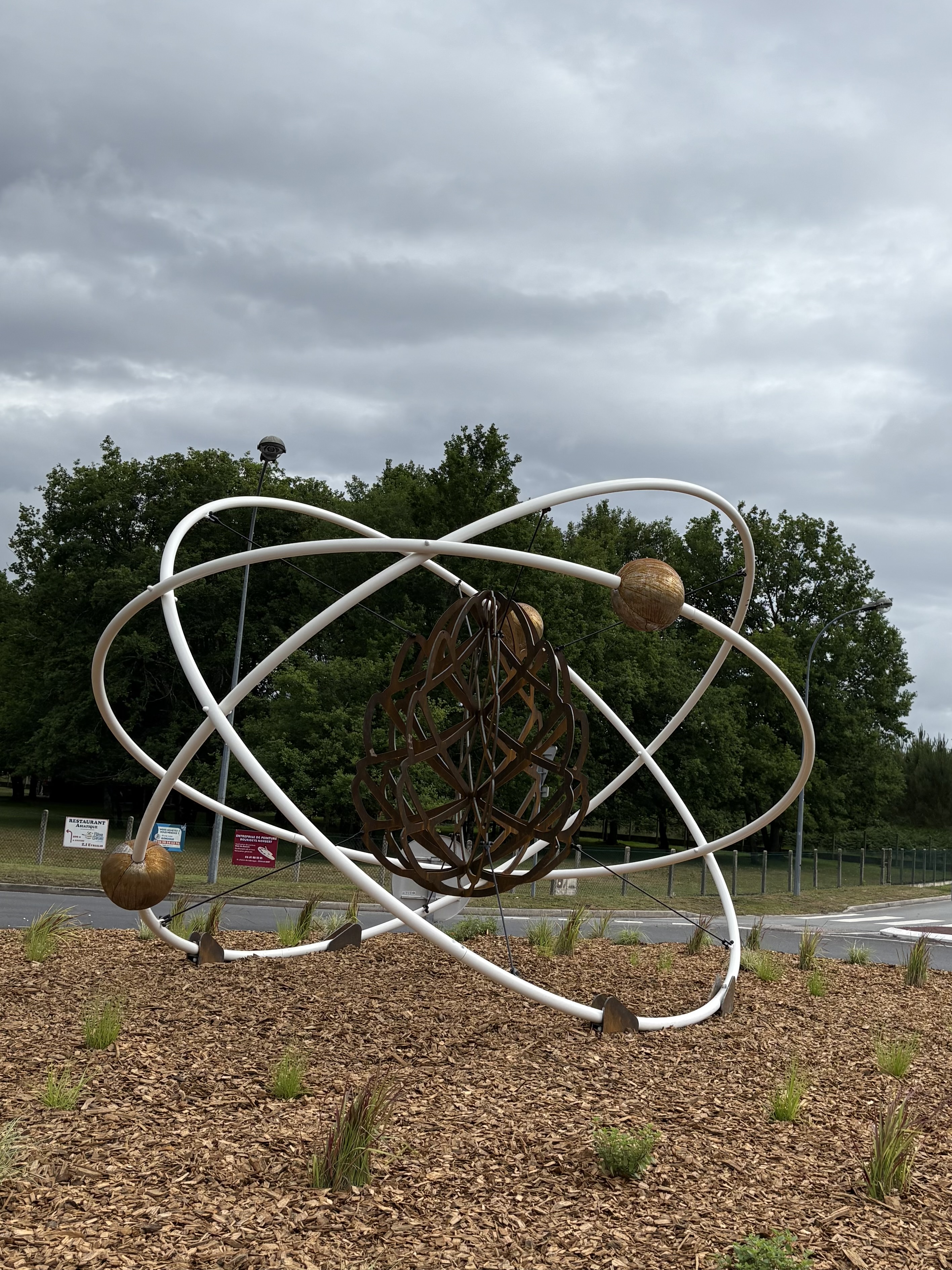 Représentant une pomme de pin entourée d’un atome d’hydrogène, cette œuvre symbolise la nature locale et la science, en référence à la proximité du CEA CESTA.